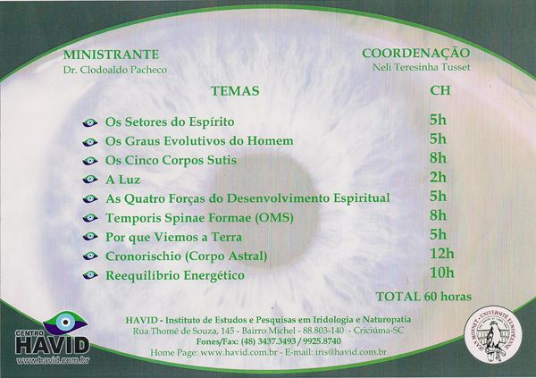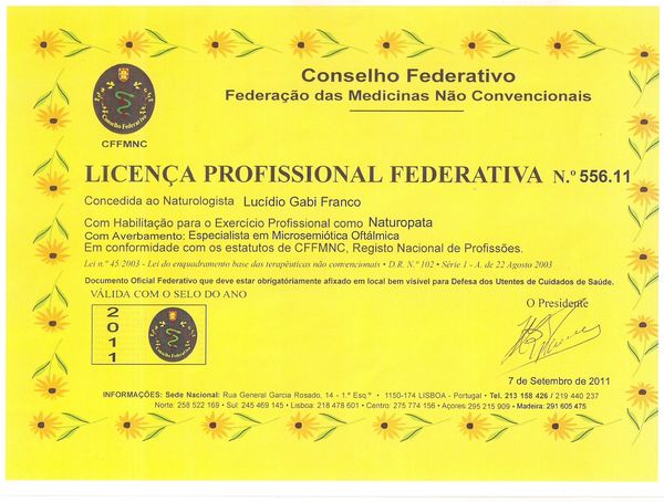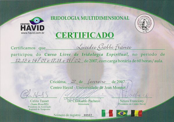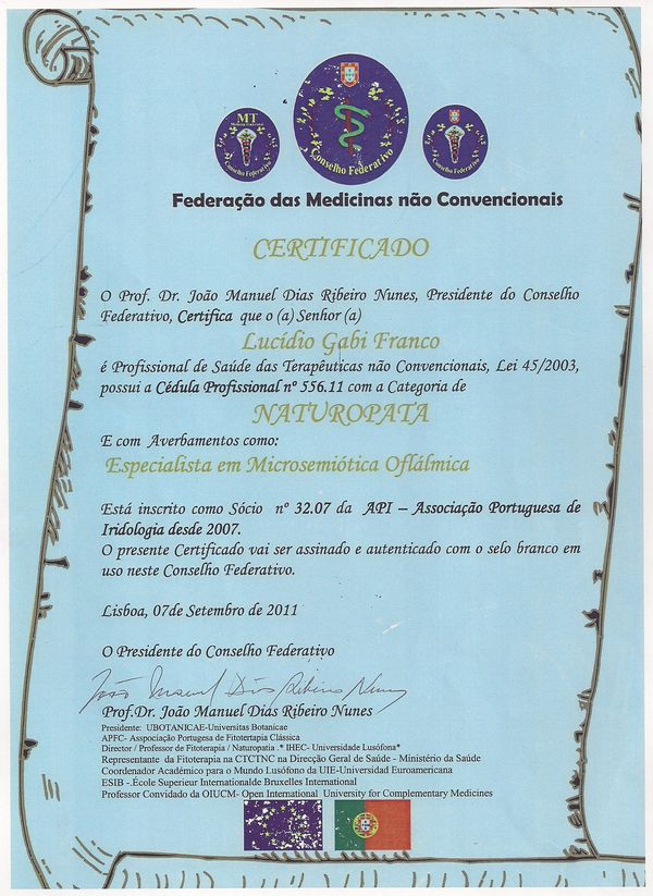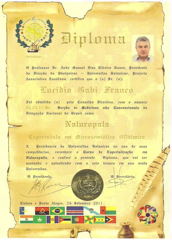 Graduado em Naturopatia pela Universidade Jean Monet/ Ubotanicae/ Lisboa Portugal. Especialista em Microsemiótica Irídea. Master em Terapia Flor de íris e Biografia Humana.